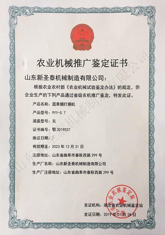 进入2019年,山东新圣泰又有一款捡拾打捆机产品获得农机推广鉴定证书(证书编号:鄂2019037),具有了享受国家农机购置补贴的资格,该产品为9YY-0.7型圆草捆打捆机,为拖拉机牵引式,捡拾幅宽1.8m。至此,山东新圣泰以上两款产品今年均可以享受国家农机产品购置补贴,为直接购机客户带来了福音,也为广大经销商增加了经销产品的选择余地。山东新圣泰将一如既往,弘扬工匠精神,生产制造符合国家标准的优质产品,为广大客户提供周到贴心的服务。