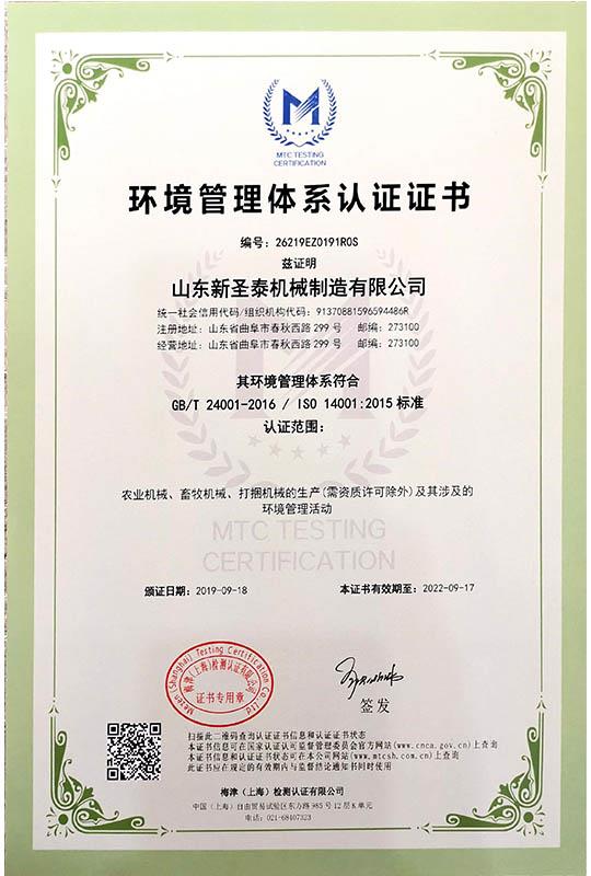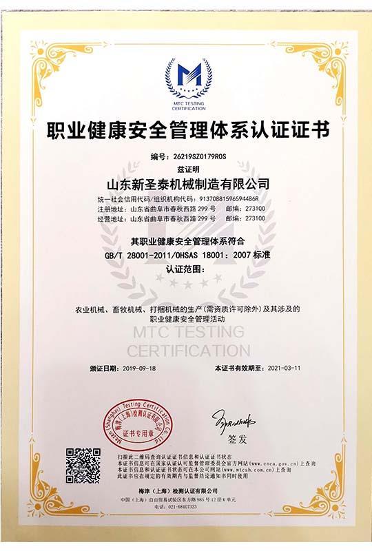 近日,山东新圣泰机械制造公司收到梅津(上海)检测认证有限公司发来的《环境管理体系认证证书》和《职业健康安全管理体系认证证书》。